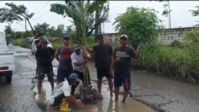 LINTAS24NEWS.com – Puluhan warga Desa Tanjung Pasir, Kecamatan Teluknaga, Kabupaten Tangerang, menggelar aksi protes terhadap kondisi infrastruktur yang memprihatinkan. Sebagai bentuk kekecewaan atas lambannya respons pemerintah daerah, warga menanam pohon pisang di tengah jalan yang rusak parah dan kerap terendam banjir.