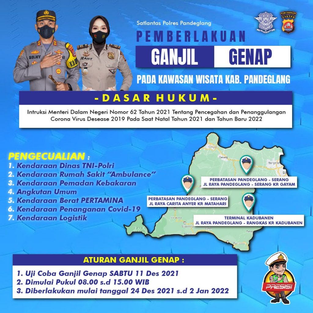 Jeany menambahkan jika Satlantas Polres Pandeglang terus menghimbau tentang aturan ganjil genap ini. “Jadi masyarakat yang akan menuju Pandeglang dan sebaliknya, pada tanggal 24 Desember 2021 sampai dengan 2 Januari 2022 akan diberlakukan ganjil genap di tiga titik yakni di perbatasan Pandeglang-Serang tepatnya di Kp. Gayam, kemudian di perbatasan Pandeglang-Lebak atau di Terminal Kadubanen, terakhir di kawasan Wisata Carita. Agar masyarakat dapat menyesuaikan plat nomor kendaraanya jika ingin menuju wilayah Pandeglang,” ucap Jeany.