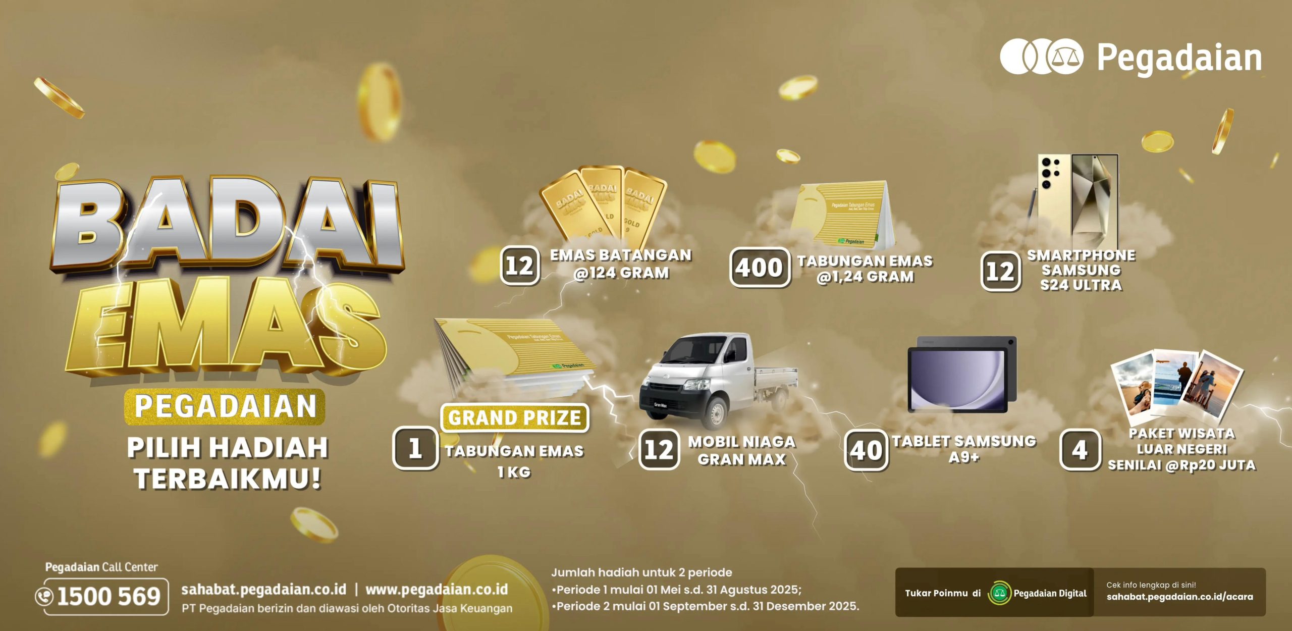“Badai Emas Pegadaian 2025” menawarkan beragam hadiah menarik yang disesuaikan dengan kebutuhan nasabah. Bagi Anda yang berinvestasi emas, tersedia: