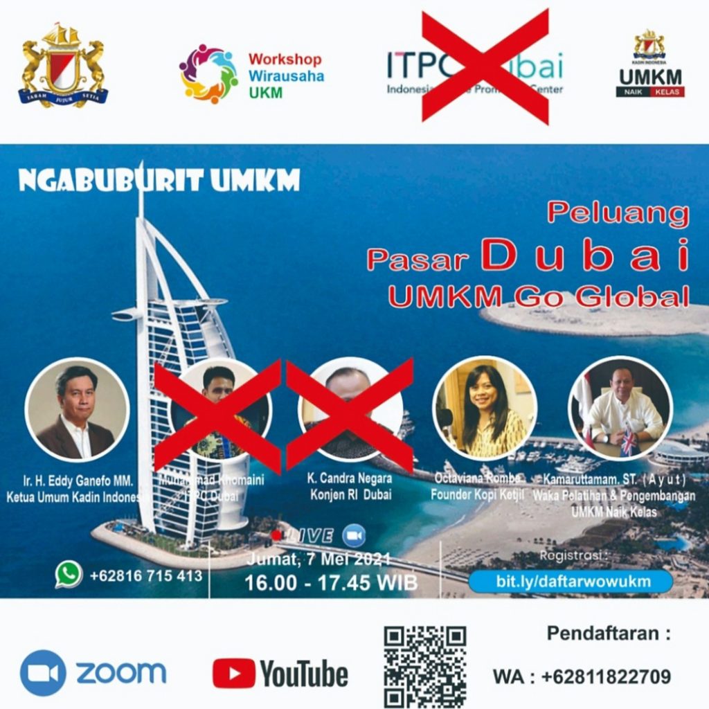 LINTAS24NEWS.com – Beredar kabar dua narasumber yang semula bersedia menjadi pemateri untuk kegiatan Webinar ‘Pasar Dubai UMKM Go Global’ yang rencana digelar pada Jumat 7 Mei 2021, mendadak mengundurkan diri.