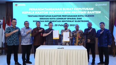 LINTAS24NEWS.com, SERANG – Kepala Kantor Wilayah Badan Pertanahan Nasional (BPN) Provinsi Banten, Sudaryanto Kamis (29/2/2024) siang menetapkan Kantor Pertanahan Kota Cilegon sebagai Kota Lengkap Spasial dan Siap Mengimplementasikan Sertipikat Elektronik.