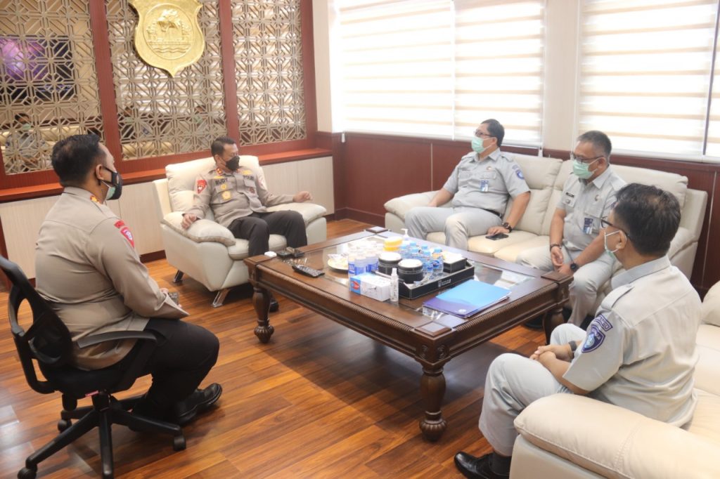 LINTAS24NEWS.com – Kapolda Banten Irjen pol Dr Rudy Heriyanto Adi Nugroho S.H.,M.H.,M.B.A di dampingi oleh Dir Lantas Polda Banten Kombes Pol. Rudy Poernomo menerima kunjungan kerja Kepala PT. Jasa Raharja Cabang Serang Dodi Apriansyah, di Mapolda Banten, Selasa (03/8/2021) Pukul 09.00 WIB
