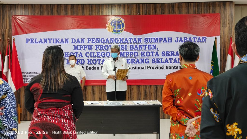 LINTAS24NEWS.com – Dalam rangka menyesuaian susunan keanggotaan Kepala Kantor Wilayah Badan Pertanahan Nasional Provinsi Banten Rudi Rubijaya Melantik dan Mengambil Sumpah Jabatan Majelis Pembina dan Pengawas PPAT Wilayah (MPPW) Provinsi Banten dengan Majelis Pembina dan Pengawas PPAT Daerah (MPPD) di 3 (tiga) kabupaten/kota yakni MPPD Kota Cilegon, Kota Tangerang Selatan, Kota Serang yang baru.