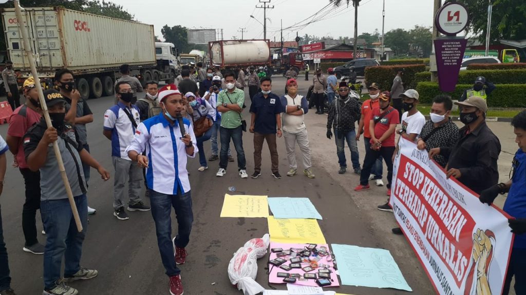 “Wartawan adalah pejuang keterbukaan informasi publik yang dilindungi oleh Undang undang Pers No 40 Tahun 1999, maka hentikan kekerasan terhadap wartawan,” ucap Angga dengan nada lantang.