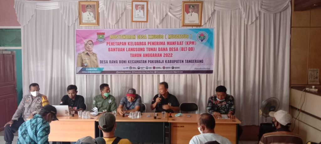 KABUPATEN TANGERANG, LINTAS24NEWS.com – Pemerintah Desa (pemdes) Rawaboni, Kecamatan Pakuhaji, Kabupaten Tangerang melaksanakan Musyawarah Desa Khusus (Musdesus) penetapan keluarga penerima manfaat (KPM) Bantuan Langsung Tunai (BLT) tahun anggaran 2022 yang berlangsung di aula kantor Desa Rawaboni, Sabtu (19/3/2022).