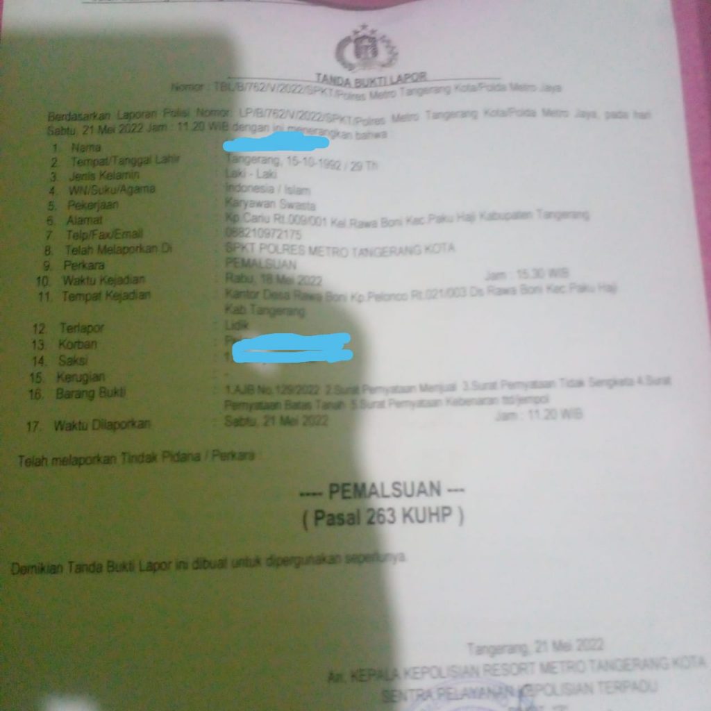 KABUPATEN TANGERANG, LINTAS24NEWS.com – Diduga membuat surat kelengkapan administrasi untuk syarat pembuatan akta jual beli (AJB) tanah yang berada di Desa Rawaboni Kecamatan Pakuhaji Kabupaten Tangerang, Kepala Desa Rawaboni melalui Sekertaris Desa sudah melaporkan peristiwa tersebut ke polres metro Tangerang kota berdasarkan laporan polisi nomor : LP/B/ 762/V/2022/SPKT Polres Metro Tangerang Kota Polda Metro Jaya. Sabtu (21/05/2022)