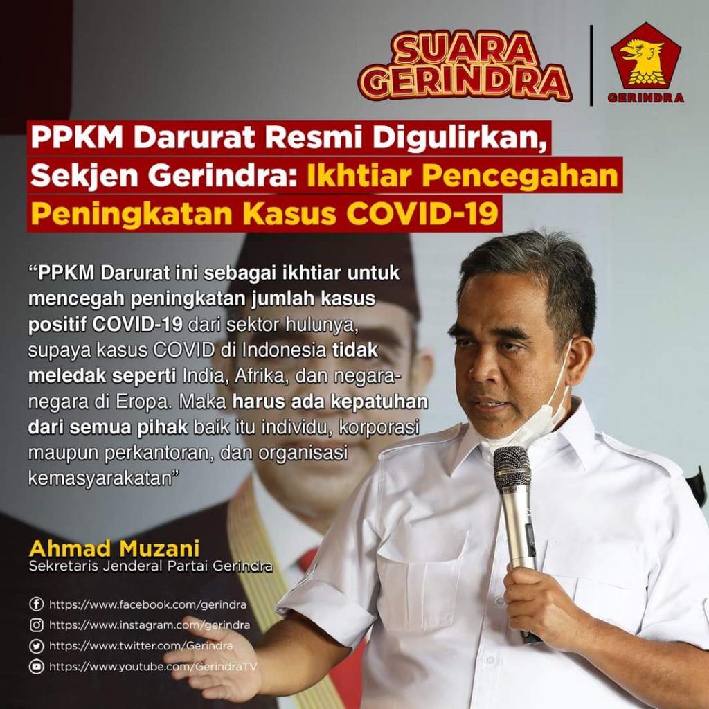 “Apa yang telah diputuskan pemerintah dengan memperpanjang PPKM saya kira itu hal baik untuk memutus mata rantai covid19. Namun, masyarakat yang terdampak ini tidak kalah penting untuk mendapat perhatian akibat dari pemberlakuan kebijakan PPKM darurat ini. Maka upaya untuk memberi bantuan kepada mereka yang terdampak sungguh menjadi penting, supaya ketaatan mereka kepada ppkm darurat ini tidak terganggu oleh ketidaktersediaan bahan pangan di keluarganya. Sehingga dapur tetap ngebul,” kata Ketua Fraksi Gerindra di DPR, Ahmad Muzani dalam keterangannya.