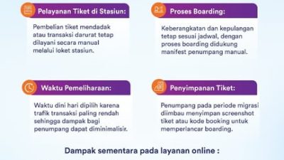 PT Kereta Api Indonesia (Persero) akan melakukan migrasi dan penguatan kapasitas Rail Ticketing System (RTS) pada Rabu, 21 Januari 2026, pukul 00.00 hingga 04.00 WIB. Langkah ini mencakup seluruh sistem pemesanan tiket, baik Kereta Api Jarak Jauh (KAJJ) maupun KA Lokal (KAI & KAI Commuter), guna memastikan keandalan layanan menjelang masa Angkutan Lebaran.