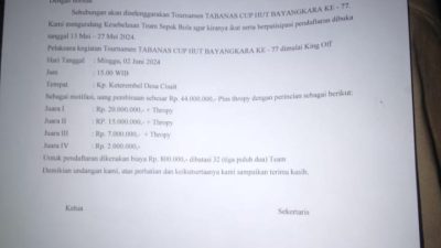 Sementara itu Asosiasi Sepakbola Kecamatan Kragilan Anis dikonfirmasi melalui sambungan telepon, pelaksanaan Tabanas Cup HUT Bhayangkara ke 77 yang diselenggarakan oleh Karang Taruna Desa Cisait, Kecamatan Kragilan, Kabupaten Serang tidak ada pemberitahuan kepada kami (Ascam Kragilan),” Kami tidak pernah dilibatkan dan tidak pernah mendapatkan pemberitahuan dari panitia pelaksana,” ujar Anis, Jum’at (31/5/2024) sore.