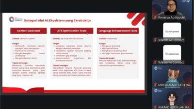 Telkom AI Center of Excellence (AI Center) Jakarta melalui Pilar AI Connect telah sukses melaksanakan workshop persiapan karir yang mengintegrasikan AI untuk para pelajar dan mahasiswa pada Kamis, 11 Desember 2025 secara daring. Workshop ini memiliki tujuan untuk meningkatkan awareness para pelajar atau mahasiswa bahwa sistem rekrutmen di dunia kerja profesional saat ini sudah mengintegrasikan AI di dalam prosesnya sehingga penting sekali bagi pelajar atau mahasiswa memanfaatkan AI dalam mempersiapkan dokumen seperti CV atau Resume (AI-Powered CV/Resume) dan menyusun strategi interview. Melalui workshop ini, AI Center Jakarta menyediakan sesi interaktif untuk pelajar dan mahasiswa dalam menyusun dan membentuk dokumen persiapan kerja yang lebih relevan dan sesuai dengan minat dan pengalaman yang dimiliki oleh para pelajar dan mahasiswa.